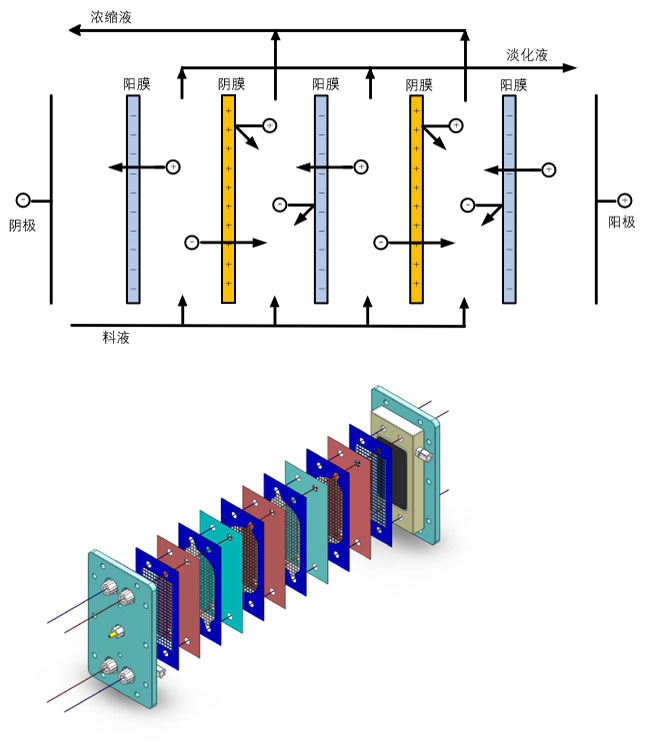 電滲析過程以電場為驅動力,利用離子交換膜對離子的選擇透過性,使陰離子和陽離子發生定向遷移,從而實現水溶液中鹽分的脫除或濃縮。